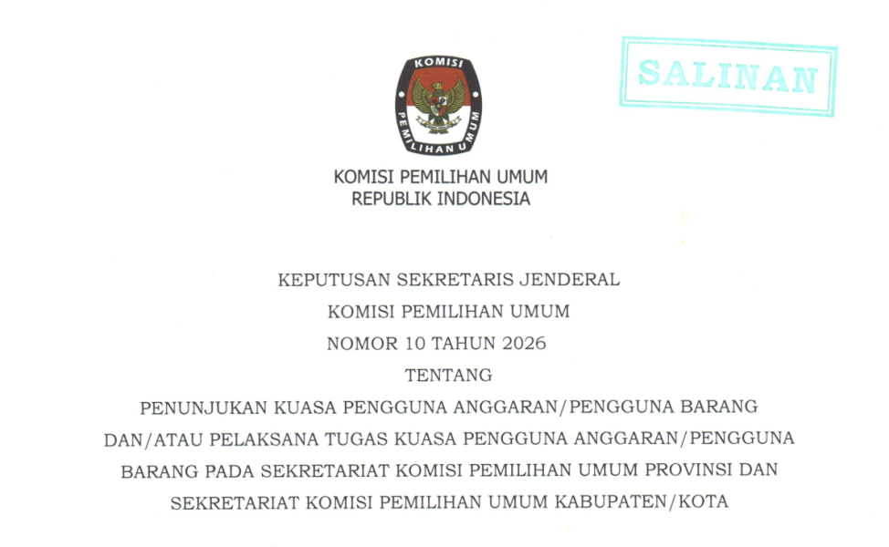 Keputusan Sekretariat Jenderal Komisi Pemilihan Umum Nomor 10 Tahun 2026 tentang Penunjukan Kuasa Pengguna Anggaran/Pengguna Barang dan/atau Pelaksana Tugas Kuasa Pengguna Anggaran/Pengguna Barang Pada Sekretariat Komisi Pemilihan Umum Provinsi dan Sekretariat Komisi Pemilihan Umum Kabupaten/Kota.....Selengkapnya....<<<<Download Disini>>>> ....