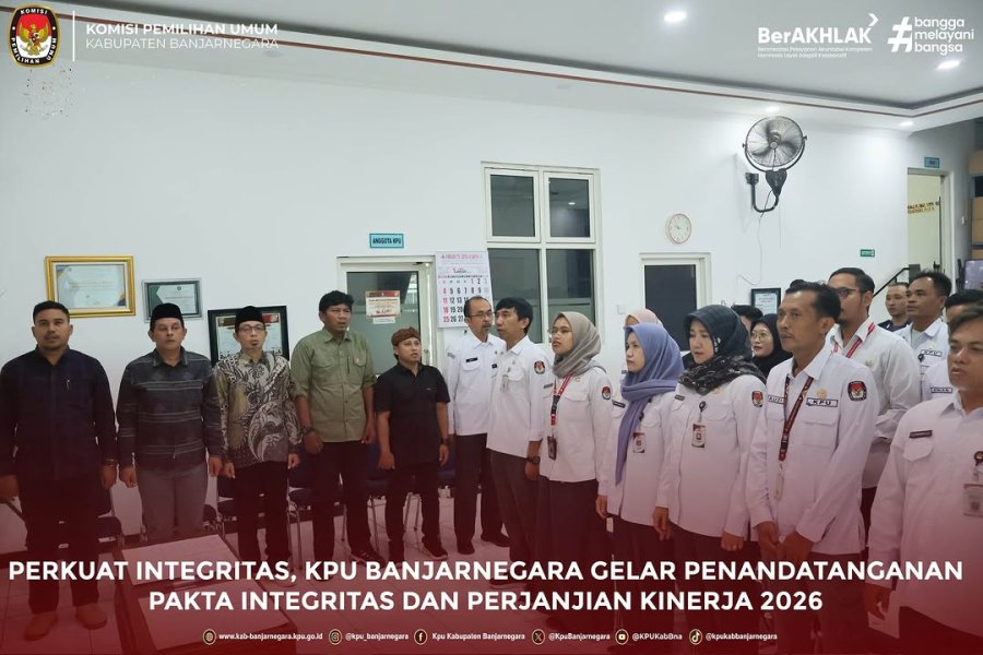 BANJARNEGARA – KPU Kabupaten Banjarnegara mengawali tahun anggaran 2026 dengan langkah nyata penguatan integritas lembaga. Pada Senin (12/1/2026), seluruh pimpinan dan pegawai Sekretariat KPU Kabupaten Banjarnegara melaksanakan penandatanganan Perjanjian Kinerja, Pakta Integritas, dan Pernyataan Bebas Benturan Kepentingan. Acara yang berlangsung di Media Center KPU Kabupaten Banjarnegara ini diikuti oleh komisioner, pejabat struktural, serta seluruh staf sekretariat. Prosesi diawali dengan pembacaan poin-poin pakta integritas secara bersama-sama yang berlangsung dengan penuh khidmat. Ketua KPU Kabupaten Banjarnegara, M. Syarif SW, dalam sambutannya menekankan bahwa kegiatan ini bukan sekadar rutinitas administratif tahunan, melainkan bentuk janji suci kepada publik dan negara. "Penandatanganan ini adalah komitmen bagi kita semua untuk menjaga profesionalitas dan integritas terutama dalam menjaga kepercayaan masyarakat terhadap institusi penyelenggara pemilu," tegas Syarif. Kegiatan ditutup dengan sesi foto bersama dan komitmen seluruh pegawai untuk menciptakan lingkungan kerja yang bersih, transparan, dan bebas dari praktik korupsi maupun benturan kepentingan. ....