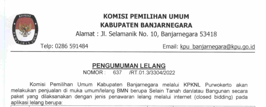 Komisi Pemilihan Umum Kabupaten Banjarnegara melalui KPKNL Purwokerto akan melakukan penjualan di muka umum/lelang BMN berupa Selain Tanah dan/atau Bangunan secara paket yang dilaksanakan dengan jenis penawaran lelang melalui internet (closed bidding) pada aplikasi lelang berupa: