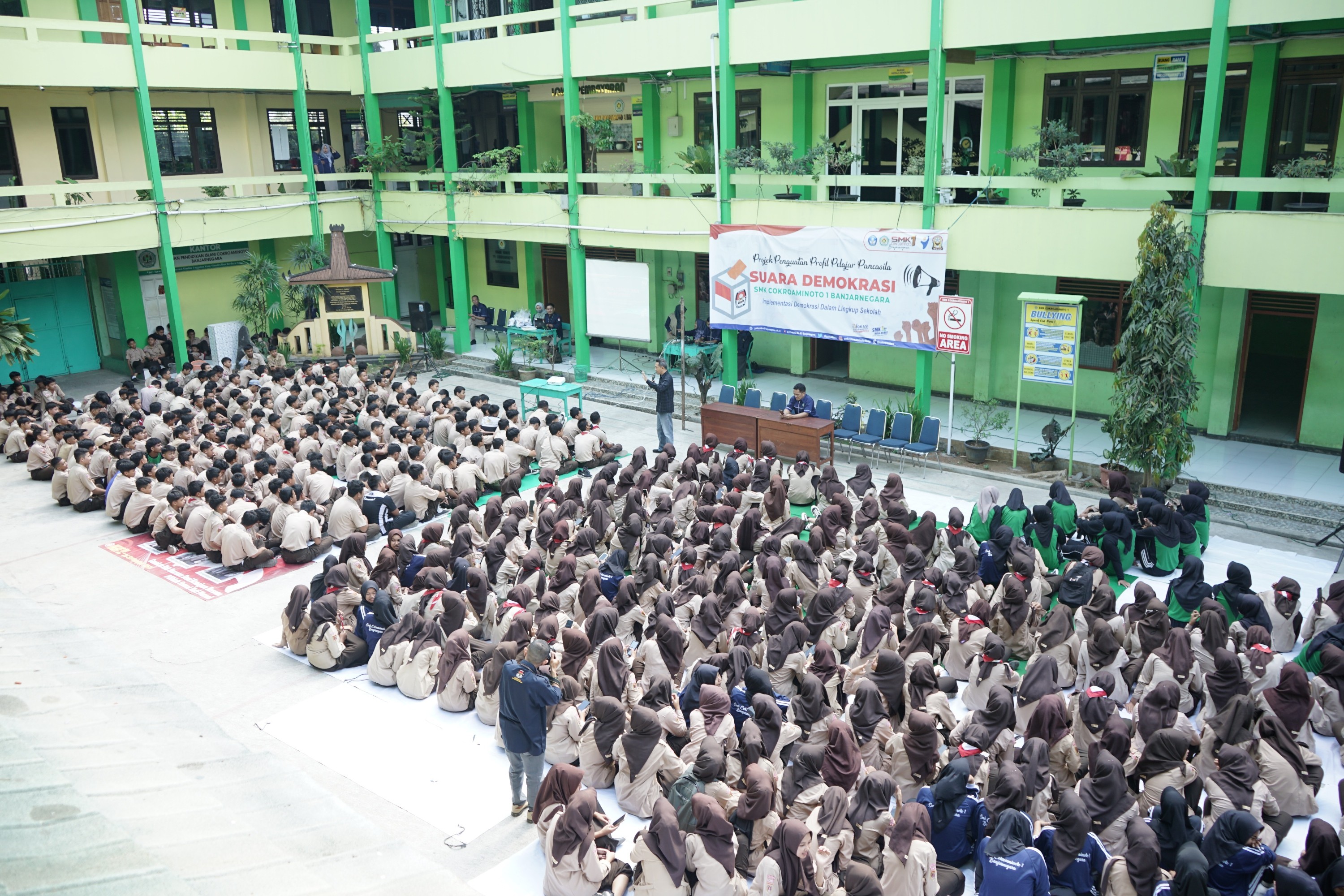BANJARNEGARA – Ratusan siswa SMK N 1 Susukan mengikuti pendidikan pemilih pemilu untuk pemilih pemula, Selasa, 10 Oktober 2023 di sekolah mereka. Kegiatan tersebut dikemas dalam Projek Penguatan Profil Pelajar Pancasila (P5) dengan tema Suara Demokrasi "Prosesi Pemilihan Umum". Kegiatan yang dipandu anggota KPU Kabupaten Banjarnegara Divisi Teknis Penyelenggaraan, Khuswatun Chasanah itu menarik perhatian para siswa. Apalagi tim KPU Kabupaten Banjarnegara juga menyediakan suvenir menarik buat siswa yang aktif bertanya atau bisa menjawab pertanyaan dengan benar. Khuswatun menerangkan tentang tema demokrasi dan pemilu. Para siswa yang merupakan Generasi Z tersebut perlu mendapatkan referensi yang benar tentang pemilu dan demokrasi. Terlebih para siswa yang sudah berusia 17 tahun atau sudah punya hak pilih, akan memilih untuk kali pertama dalam Pemilu Serentak 2024 mendatang. Seperti diketahui Bersama, pemungutan suara atau coblosan Pemilu Serentak 2024 akan digelar pada Rabu 14 Februari 2024 mendatang. Para siswa mengikuti seluruh rangkaian kegiatan tersebut dengan antusias dari awal hingga akhir.