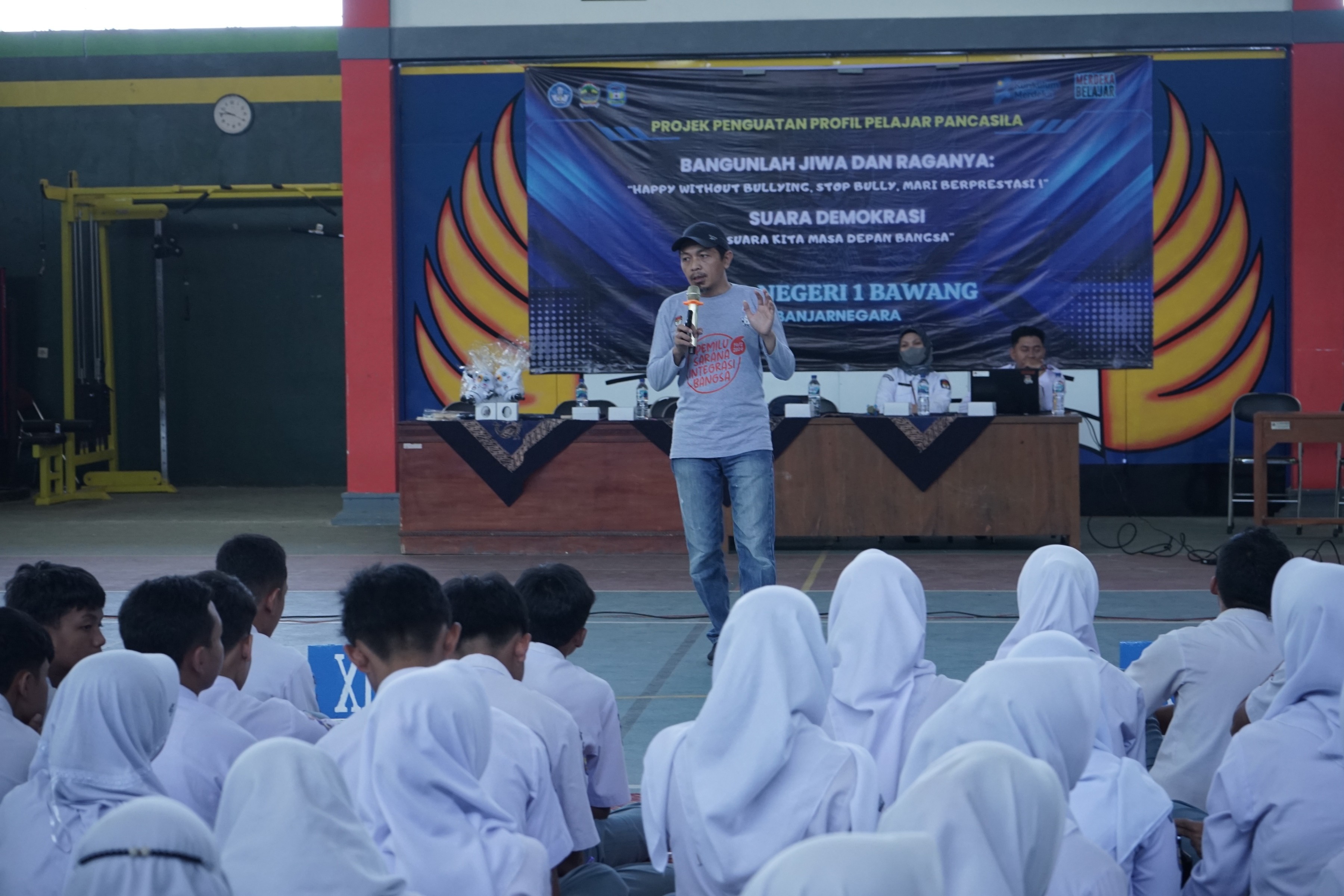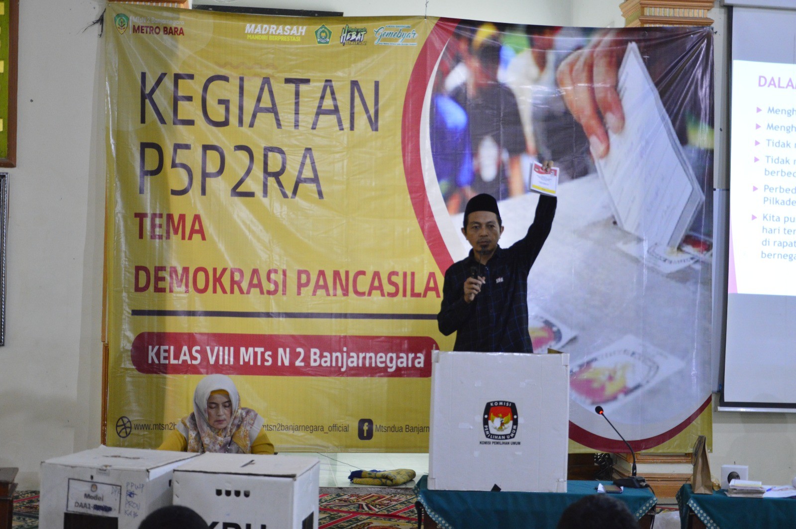 Banjarnegara - KPU Kabupaten Banjarnegara mengenalkan materi tentang pemilu dan demokrasi kepada ratusan siswa MTs Negeri 2 Banjarnegara, Sabtu (16/9/2023). "Meski para siswa belum tergolong pemilih pemula dalam Pemilu, namun sebagai bentuk pendidikan kepada pra pemilih maka kami kenalkan materi tentang demokrasi dan pemilihan umum secara sederhana," kata anggota KPU Kabupaten Banjarnegara Divisi Sosialisasi Pendidikan Pemilih Partisipasi Masyarakat dan SDM, M Syarif SW. Pendidikan pra pemilih tersebut dikemas dalam kegiatan Proyek Penguatan Profil Pelajar Pancasila (P5) dan Profil Pelajar Rahmatan Lil Alamin dengan tema Demokrasi Pancasila. Dalam kesempatan tersebut, Syarif menyampaikan belajar berdemokrasi bisa dimulai dari lingkungan terkecil di sekitar para siswa. Seperti lingkungan kelas, organisasi siswa intra madrasah/sekolah dan organisasi atau komunitas lainnya yang diikuti para siswa. "Dalam berorganisasi kita belajar menyampaikan pendapat, belajar mendengarkan pendapat orang lain, menghargai pendapat orang lain yang berbeda, saling berdiskusi memecahkan masalah bersama dan menghargai pilihan orang lain serta tidak memaksakan kehendak kita kepada orang lain atau anggota organisasi," jelasnya. Dalam bernegara, perbedaan pilihan saat Pemilu juga hendaknya disikapi dengan bijak dan dewasa. Jangan karena berbeda pendapat dan pilihan dalam Pemilu membuat awal pertikaian dan perpecahan dalam masyarakat atau negara. Kegiatan dimeriahkan dengan sesi kuis dan diberikan suvenir menarik dari KPU dan sekolah untuk siswa yang mampu menjawab pertanyaan dengan benar atau berani bertanya dan berpendapat. Suvenir yang disediakan antara lain maskot Pemilu 2024 boneka Sura dan Sulu. Kepala MTs Negeri 2 Banjarnegara, Ratna, menyampaikan apresiasi dan terimakasih atas kerjasama KPU Kabupaten Banjarnegara untuk memberikan wawasan seputar pemilu dan demokrasi kepada para siswa.