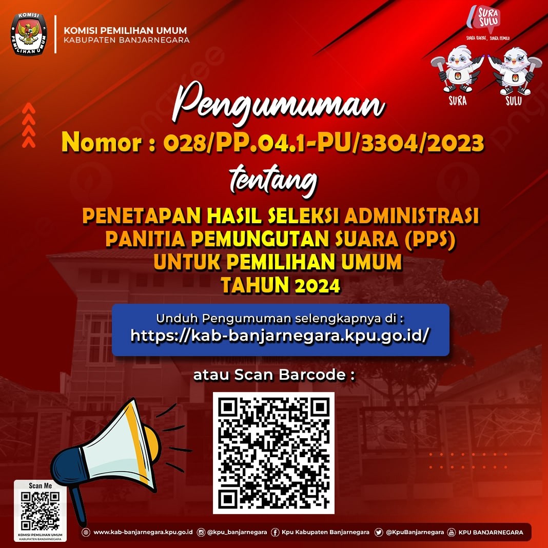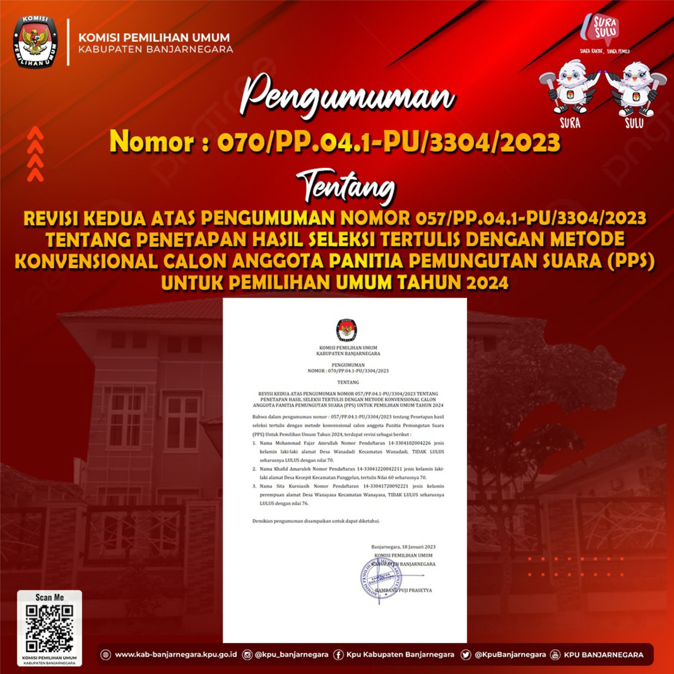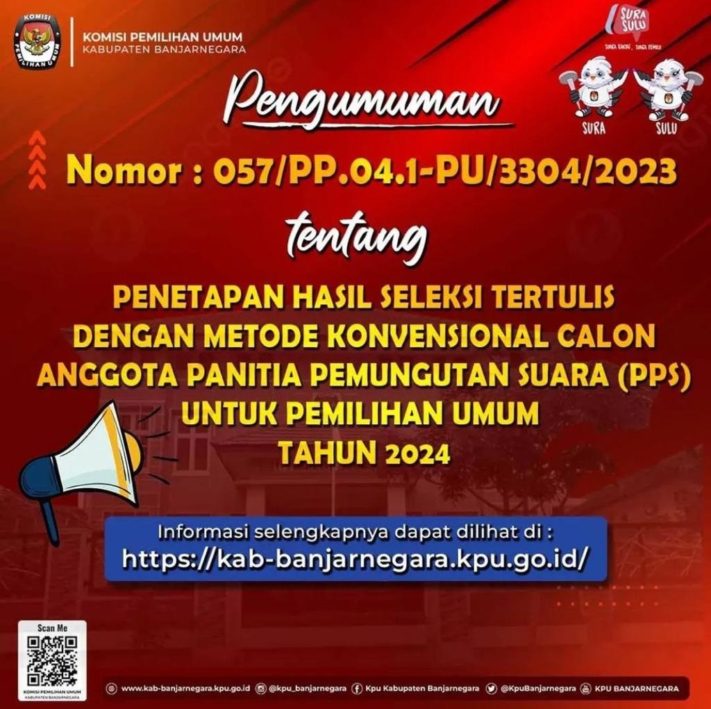 PENGUMUMAN NOMOR : 070/PP.04.1-PU/3304/2023 TENTANG REVISI KEDUA PENGUMUMAN NOMOR : 057/PP.04.1-PU/3304/2023 PENETAPAN HASIL SELEKSI TERTULIS DENGAN METODE KONVENSIONAL CALON ANGGOTA PANITIA PEMUNGUTAN SUARA (PPS) UNTUK PEMILIHAN UMUM TAHUN 2024..klik disini