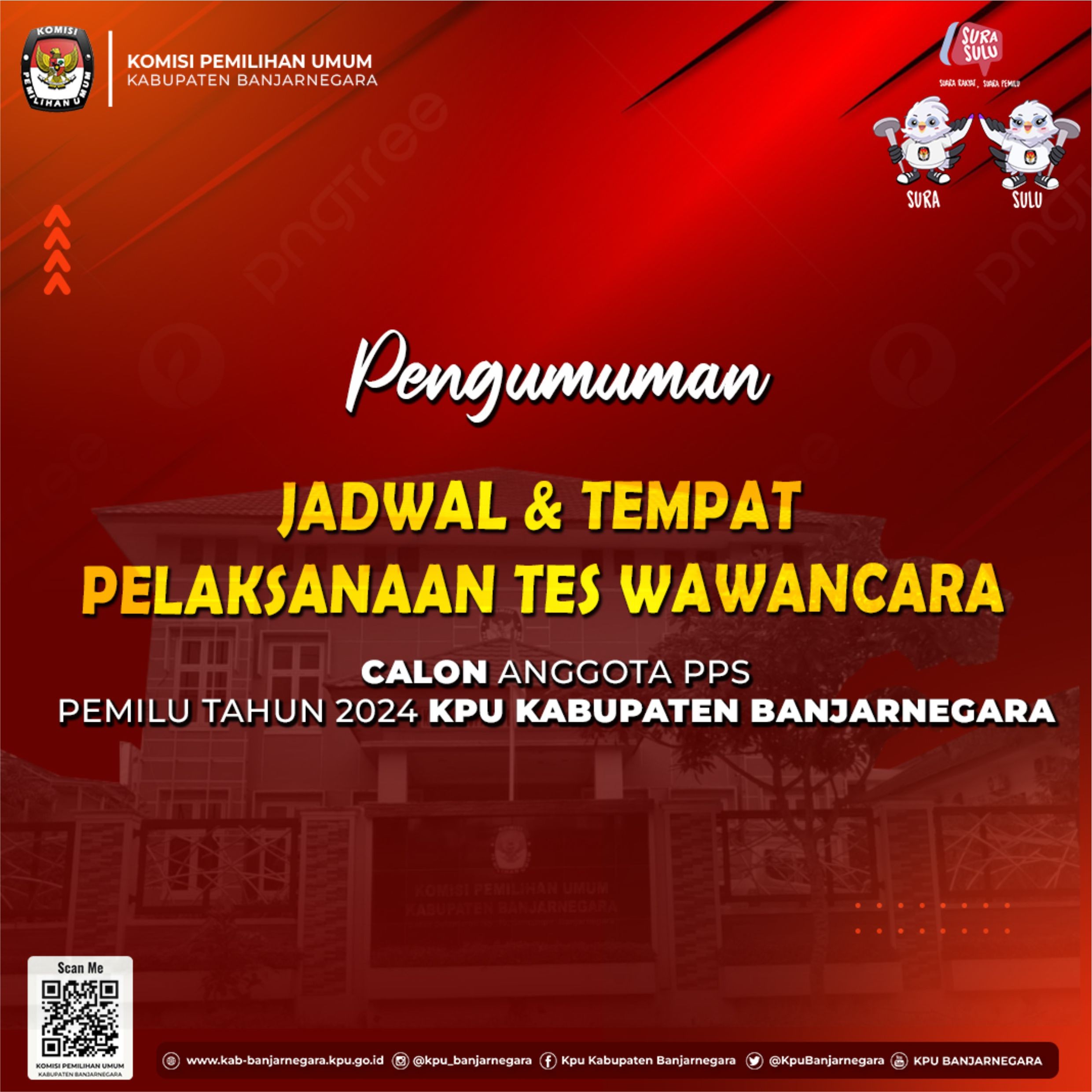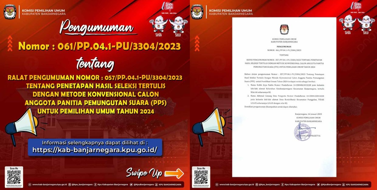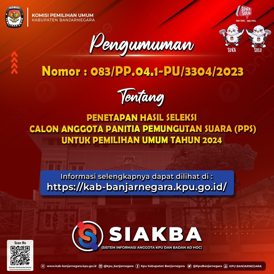 PENGUMUMAN NOMOR : 070/PP.04.1-PU/3304/2023 TENTANG REVISI KEDUA PENGUMUMAN NOMOR : 057/PP.04.1-PU/3304/2023 PENETAPAN HASIL SELEKSI TERTULIS DENGAN METODE KONVENSIONAL CALON ANGGOTA PANITIA PEMUNGUTAN SUARA (PPS) UNTUK PEMILIHAN UMUM TAHUN 2024..klik disini