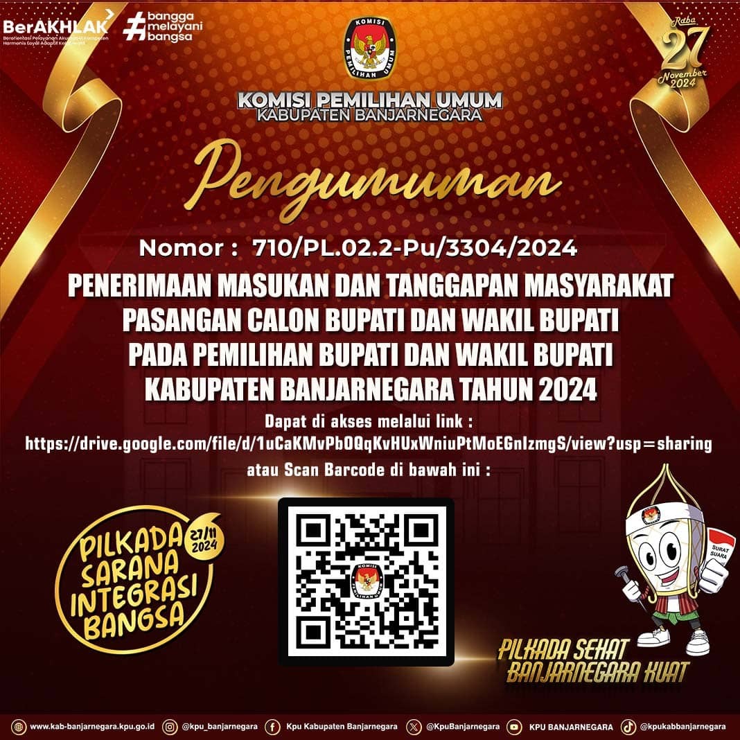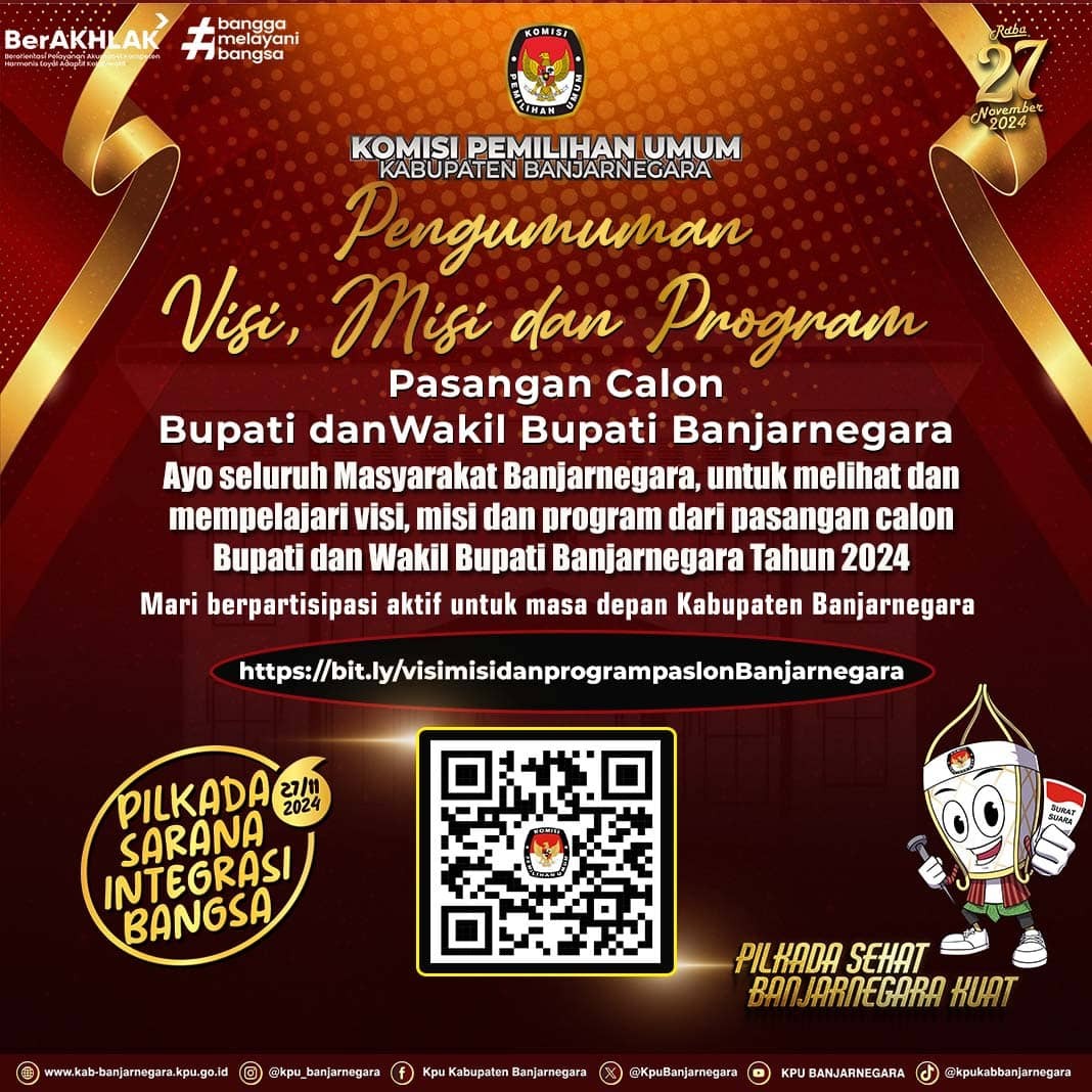 #TemanPemilih, berikut kami umumkan Visi Misi dan Program Kerja Bakal Pasangan Calon Bupati dan Wakil Bupati dalam Pemilihan Bupati dan Wakil Bupati Banjarnegara Tahun 2024.