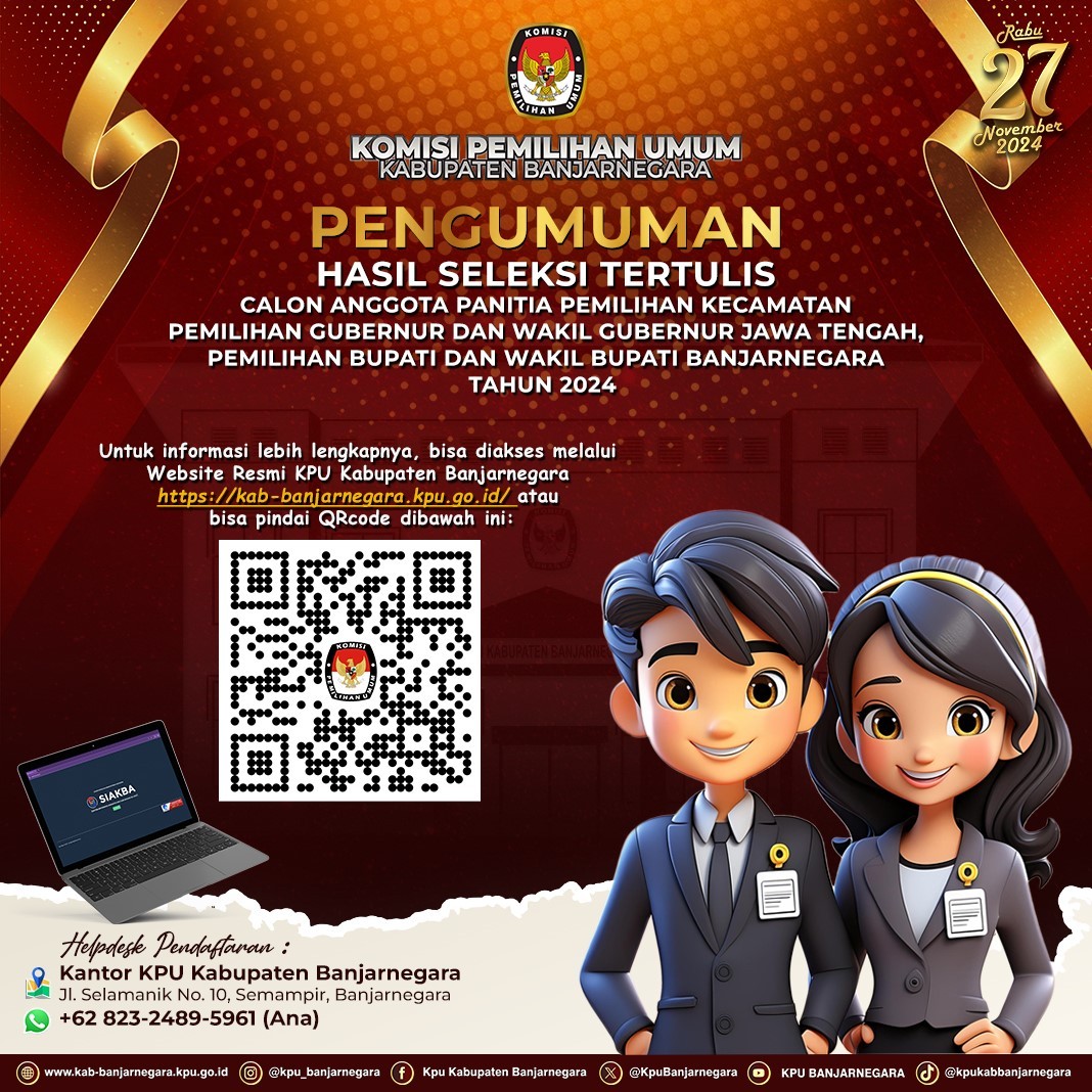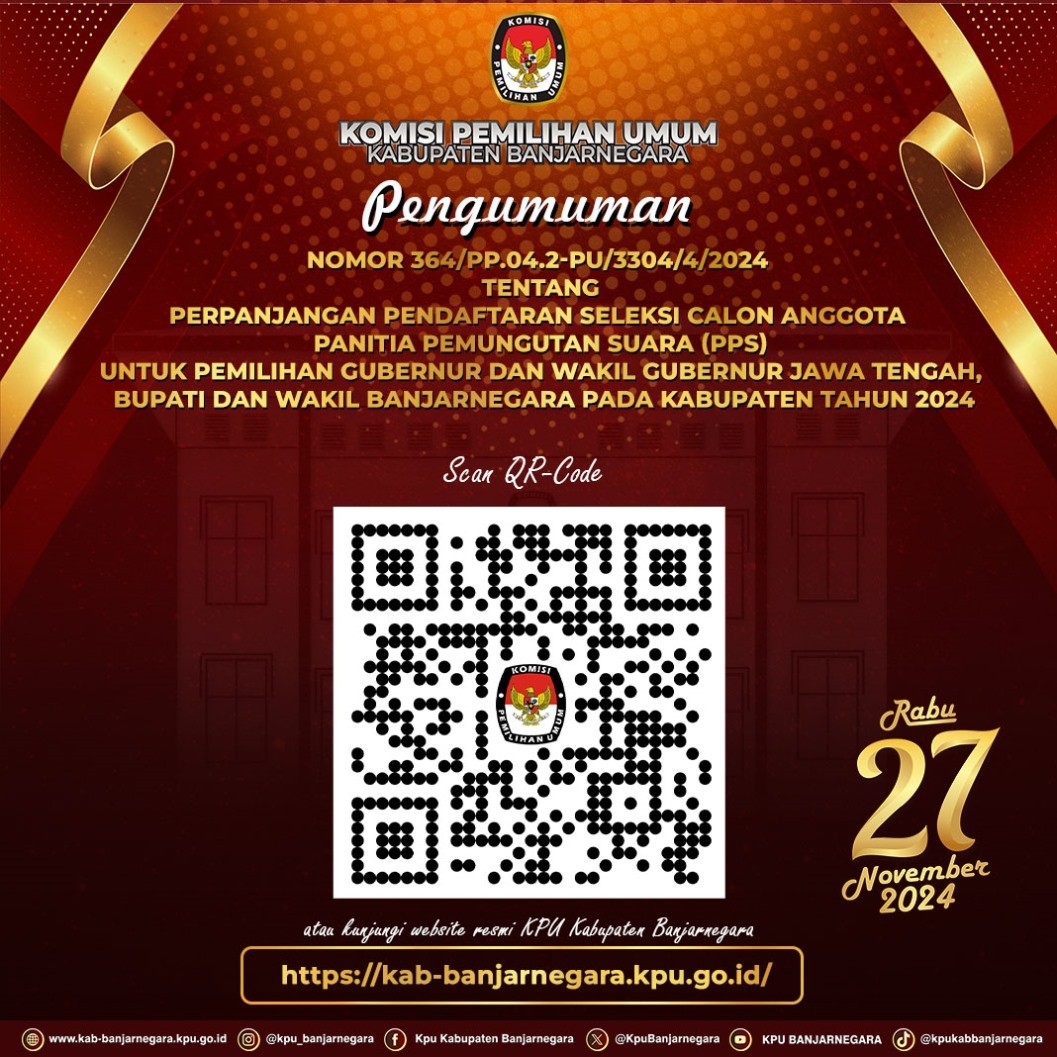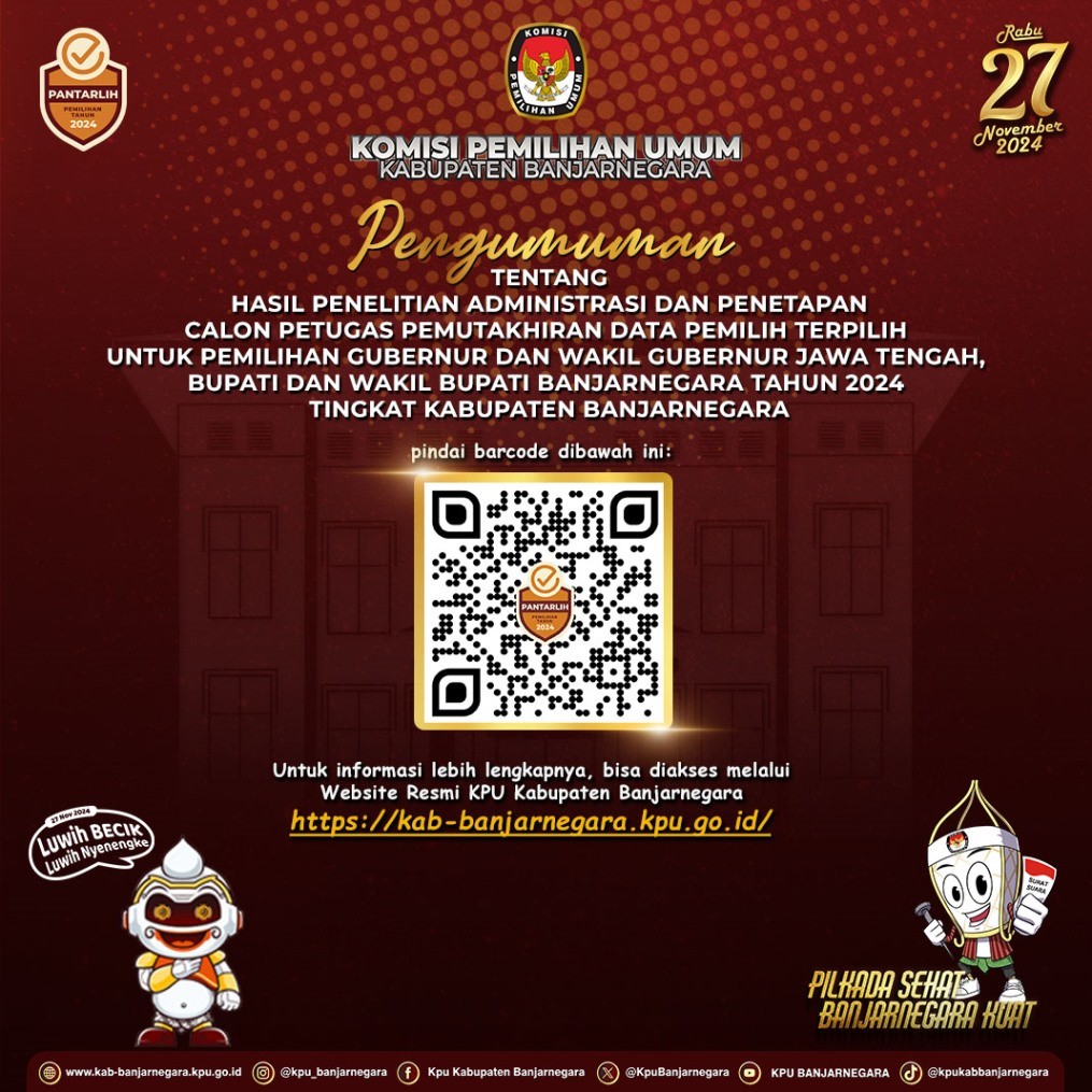 Pengumuman Nomor : 473/PP.04.2-Pu/3304/2024 Tentang Hasil Penelitian Administrasi Dan Penetapan Calon Petugas Pemutakhiran Data Pemilih Terpilih Untuk Pemilihan Gubernur Dan Wakil Gubernur Jawa Tengah, Bupati Dan Wakil Bupati Banjarnegara Tahun 2024 Tingkat Kabupaten Banjarnegara