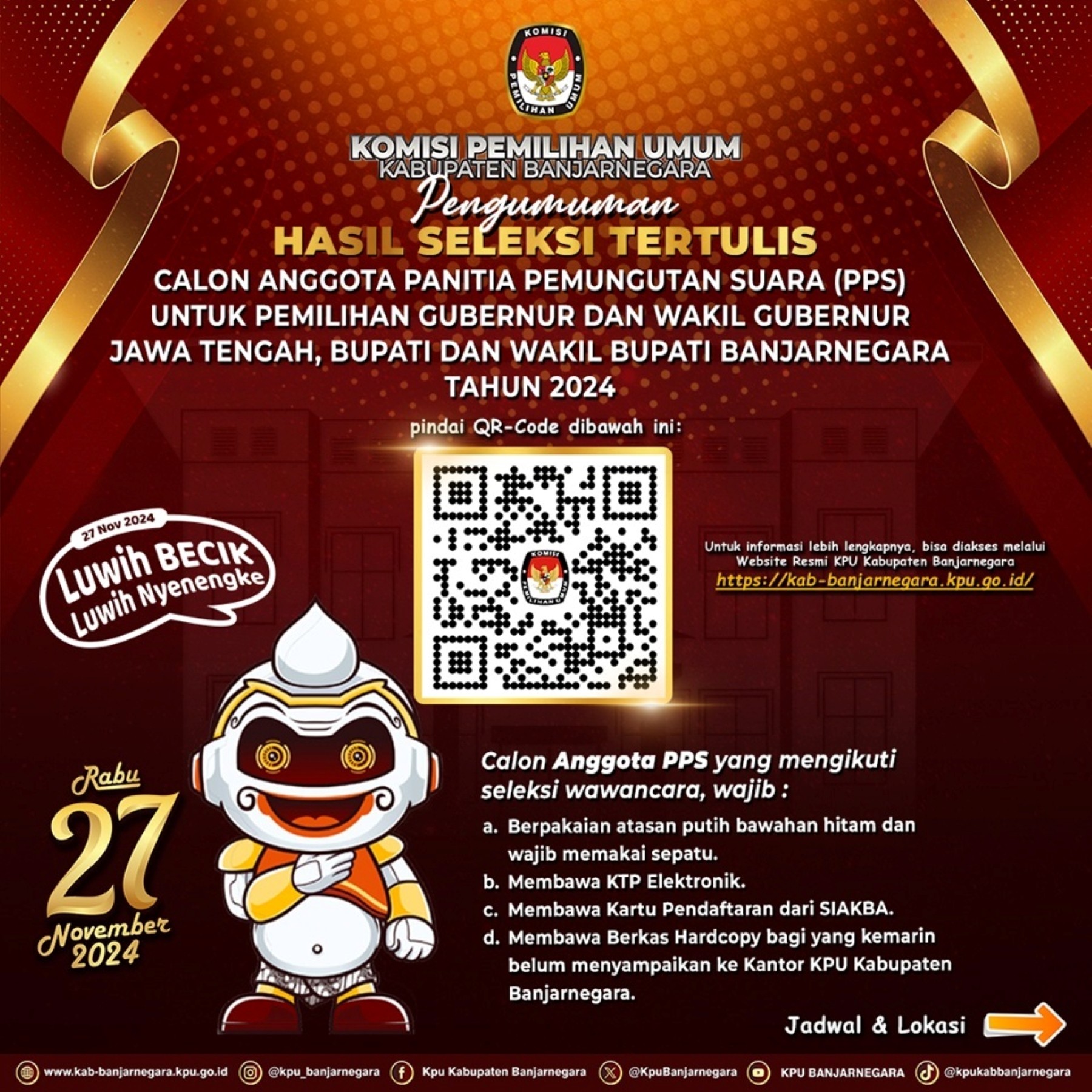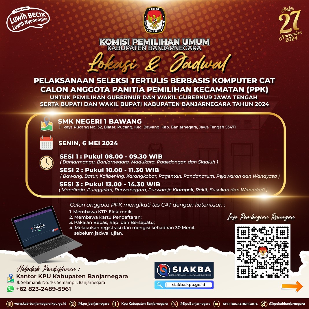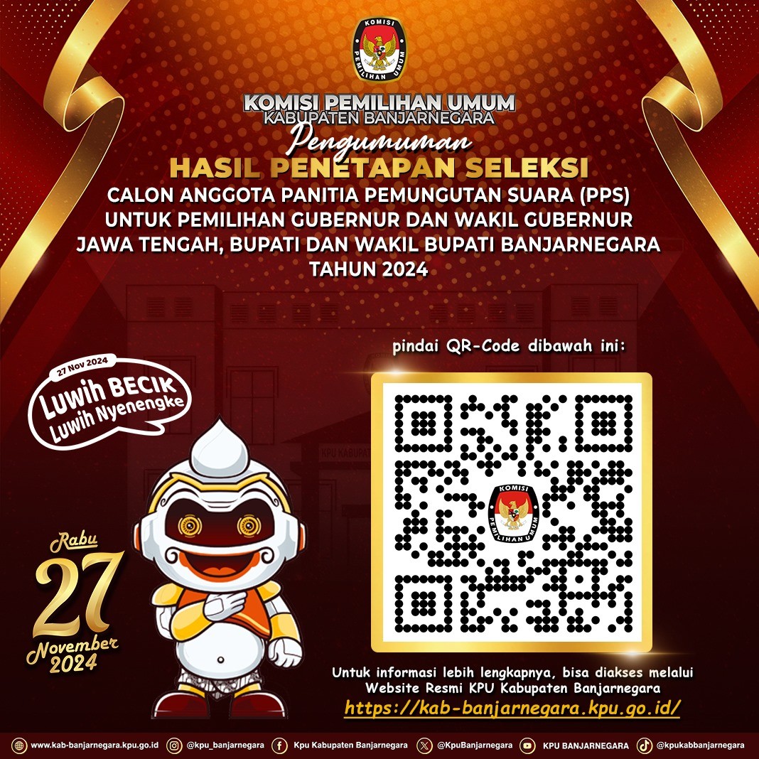 Pengumuman Nomor : 473/PP.04.2-Pu/3304/2024 Tentang Hasil Penelitian Administrasi Dan Penetapan Calon Petugas Pemutakhiran Data Pemilih Terpilih Untuk Pemilihan Gubernur Dan Wakil Gubernur Jawa Tengah, Bupati Dan Wakil Bupati Banjarnegara Tahun 2024 Tingkat Kabupaten Banjarnegara