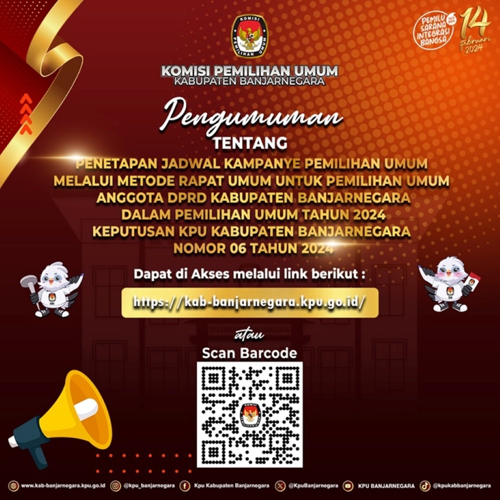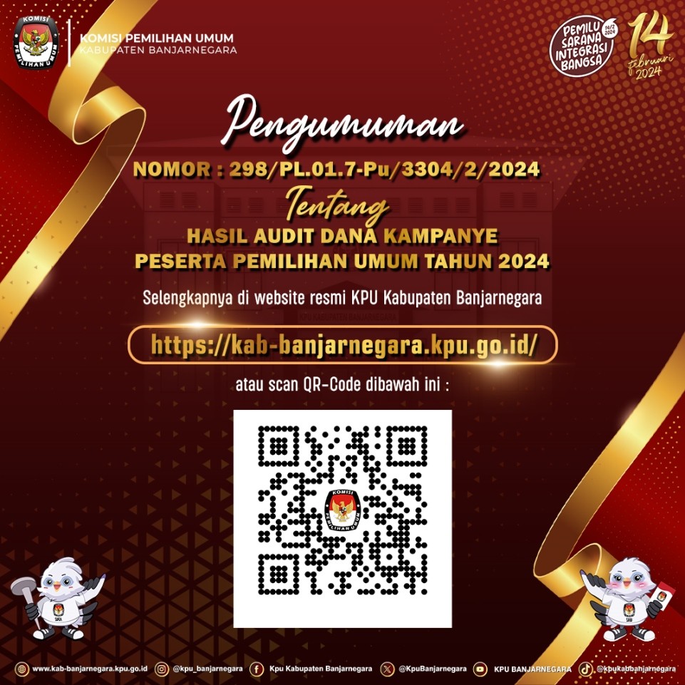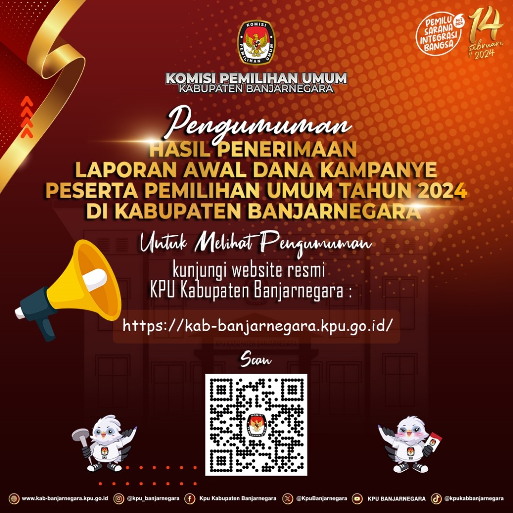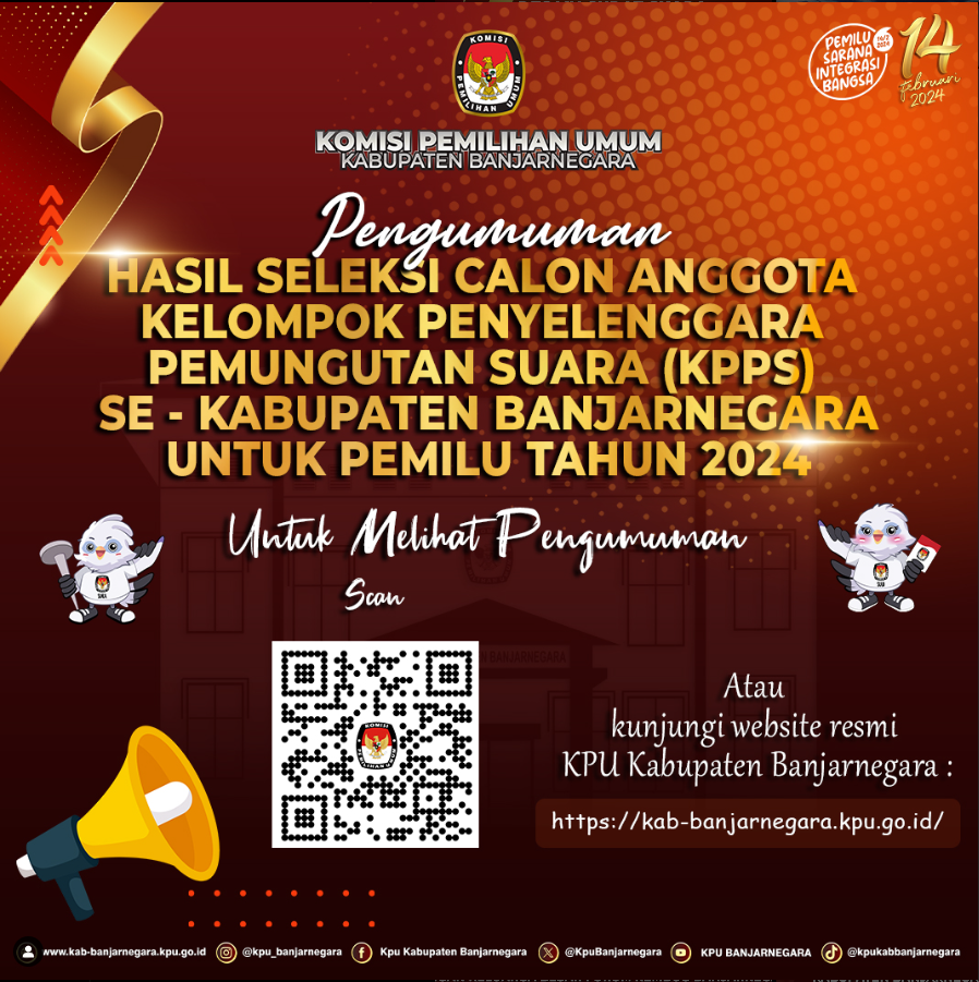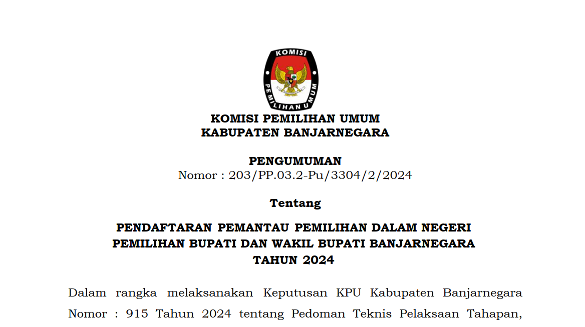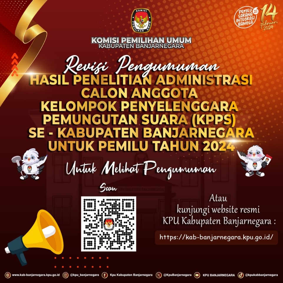 PENGUMUMAN NOMOR : 1026 /PP.04.1-Pu/ 3304/ 4/ 2023 TENTANG REVISI PENGUMUMAN NOMOR :1023 /PP.04.1-Pu/ 3304/ 4/ 2023 TENTANG HASIL PENELITIAN ADMINISTRASI CALON ANGGOTA KELOMPOK PENYELENGGARA PEMUNGUTAN SUARA UNTUK PEMILIHAN UMUM TAHUN 2024 SE-KABUPATEN BANJARNEGARA