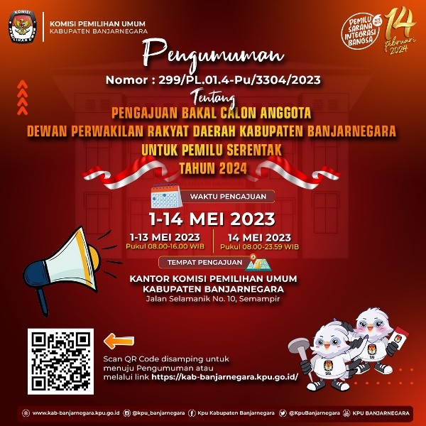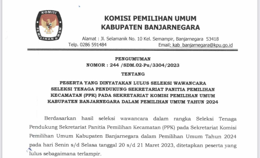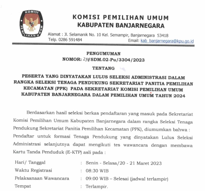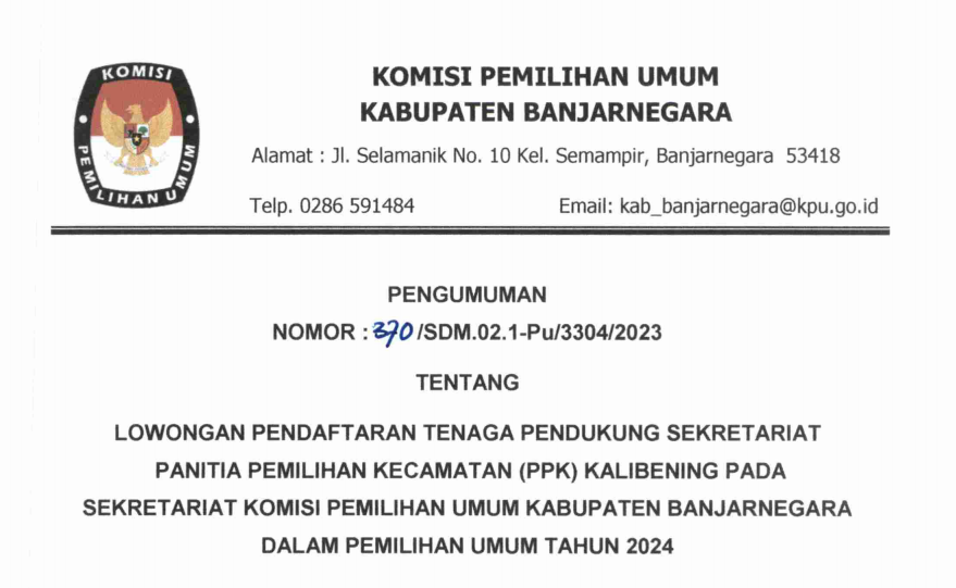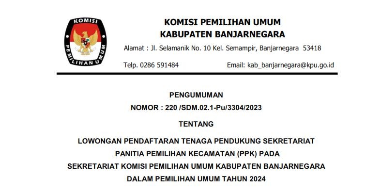 Pengumuman Lowongan Pendaftaran Tenaga Pendukung Sekretariat PPK Pada Sekretariat Komisi Pemilihan Umum Kabupaten Banjarnegara Dalam Pemilihan Umum Tahun 2024. <<Download Disini>>